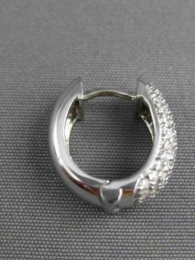 ESTATE 14KT WHITE GOLD HUGGIE HOOP EARRINGS. MULTI ROW OVAL DESIGN. DIAMONDS ARE G/H COLOR, VSSI CLARITY .53 CARATS. MEASURES 5mm X 13mm X 14mm. WRITTEN APPRAISAL AVAILABLE. COMES IN A PRESENTABLE GIFT BOX