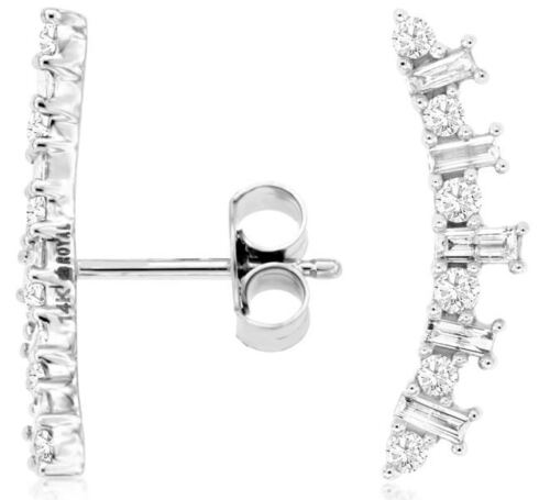 ESTATE 14KT WHITE GOLD FUN EAR CLIMBER EARRINGS. 3D CLASSIC DESIGN. ROUND AND BAGUETTE DIAMONDS ARE F/G COLOR, VSSI CLARITY .53 CARATS. WRITTEN APPRAISAL AVAILABLE. COMES IN A PRESENTABLE GIFT BOX.