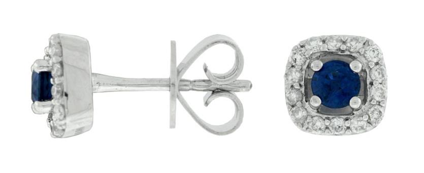 ESTATE 14KT WHITE GOLD STUD EARRINGS. 3D HALO SQUAREDESIGN. ROUND DIAMONDS ARE F/G COLOR, VSSI CLARITY .18 CARATS. ROUND AAA SAPPHIRE IS 0.35 CARATS.WRITTEN APPRAISAL AVAILABLE. COMES IN A PRESENTABLE GIFT BOX.