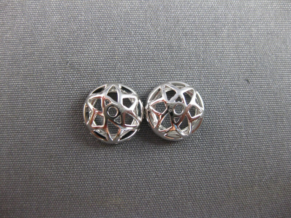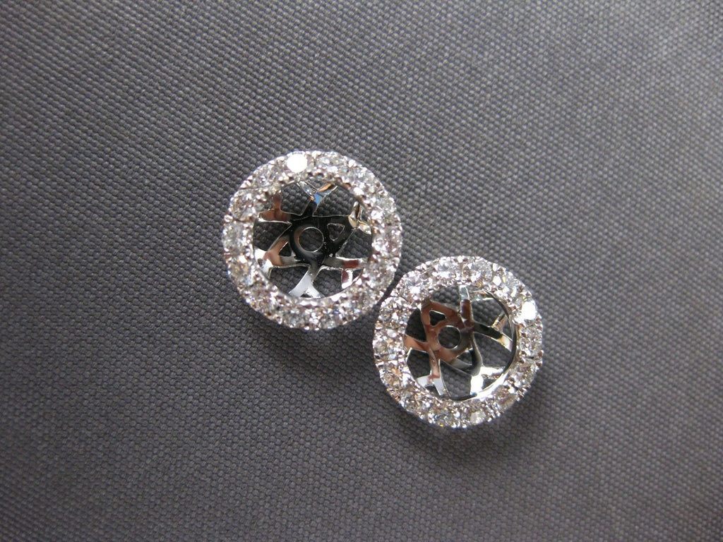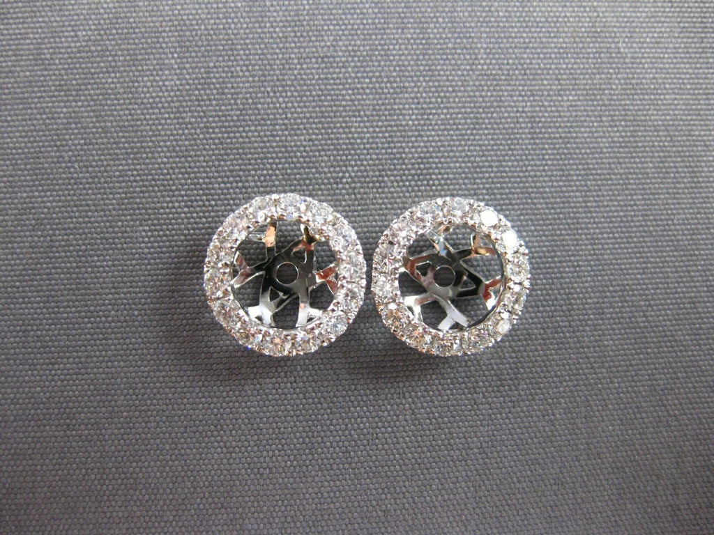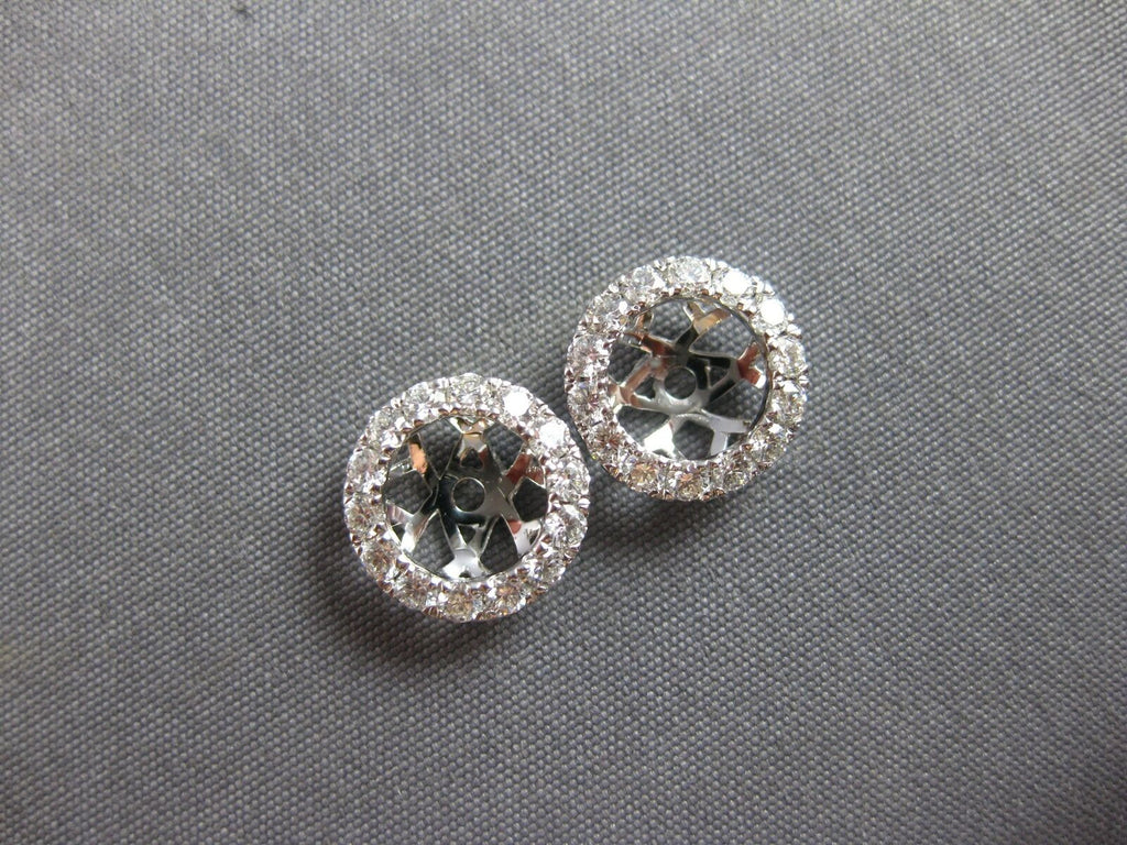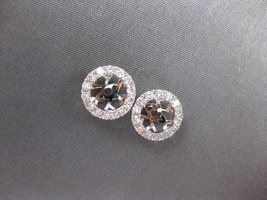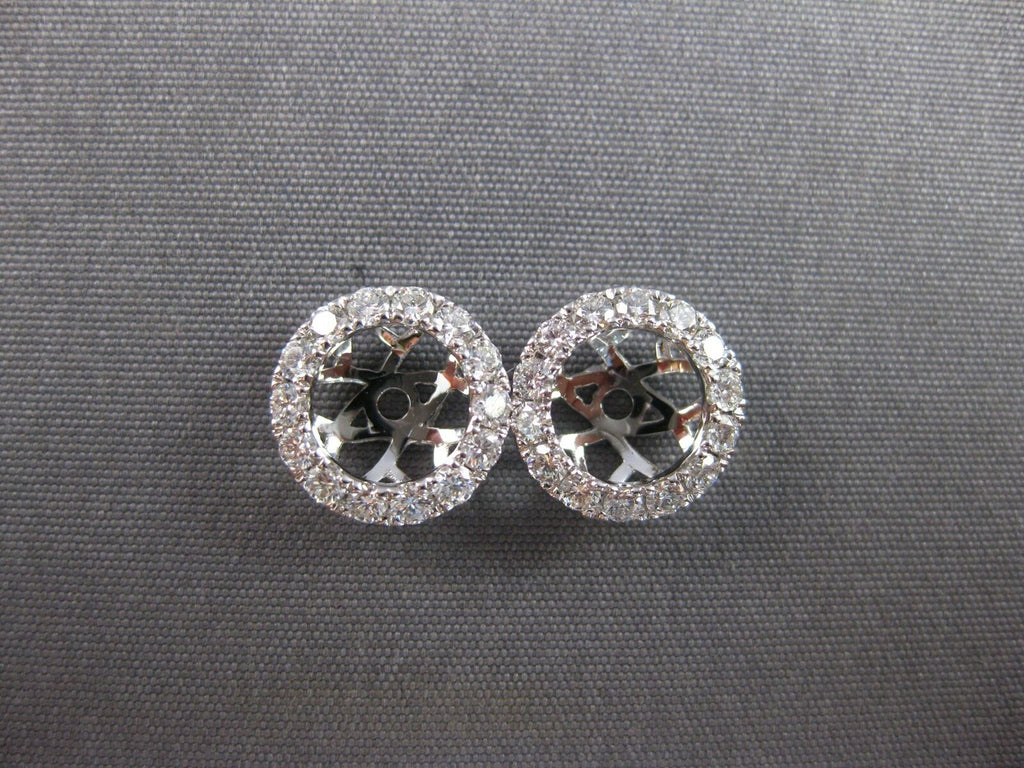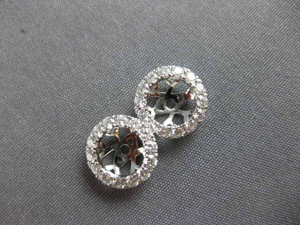 ESTATE 18KT WHITE GOLD EARRING JACKETS. 3D CLASSIC DESIGN. ROUND DIAMONDS ARE F/G COLOR, VSSI CLARITY .54 CARATS. MEASURES 9MM WIDE. FITS 4-5MM STONE. WRITTEN APPRAISAL AVAILABLE. COMES IN A PRESENTABLE GIFT BOX.