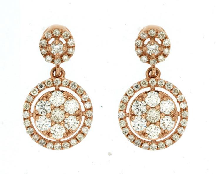 ESTATE 14KT ROSE GOLD HANGING EARRINGS. 3D CLUSTER FLOWER CIRCULAR DESIGN. DIAMONDS ARE F/G COLOR, VSSI CLARITY .55 CARATS. WRITTEN APPRAISAL AVAILABLE. COMES IN A PRESENTABLE GIFT BOX.