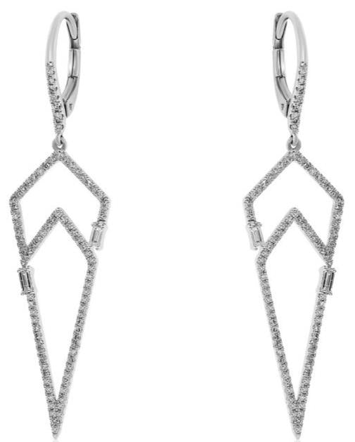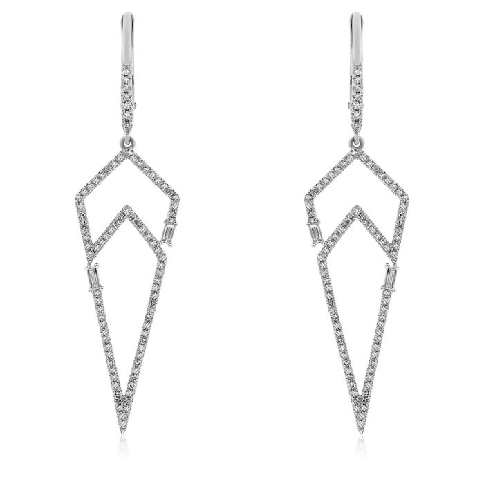 ESTATE 14KT WHITE GOLD LEVERBACK HANGING EARRINGS. 3D TRIANGULAR DESIGN. DIAMONDS ARE F/G COLOR, VSSI CLARITY .55 CARATS. WRITTEN APPRAISAL AVAILABLE. COMES IN A PRESENTABLE GIFT BOX.