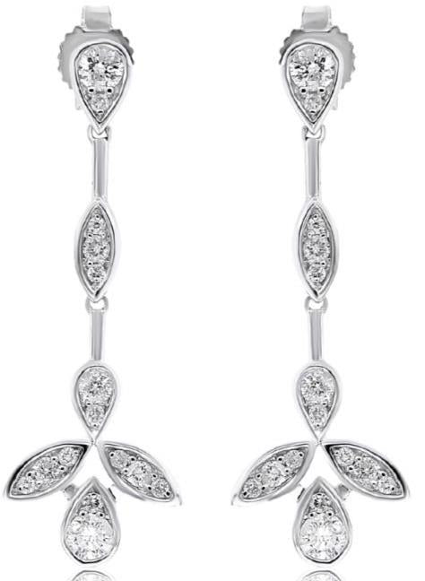 14KT WHITE GOLD HANGING EARRINGS. 3D LEAF FLOWERBY THE YARD DESIGN. DIAMONDS ARE F/G COLOR, VSSI CLARITY .56 CARATS. WRITTEN APPRAISAL AVAILABLE. COMES IN A PRESENTABLE GIFT BOX.