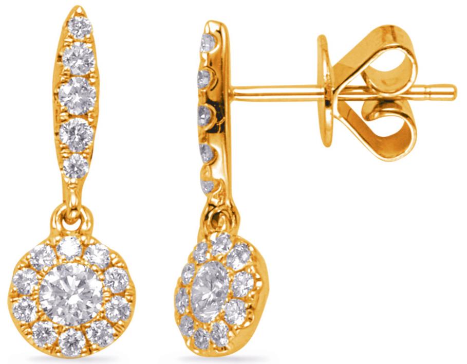 ESTATE 14KT YELLOW GOLD HANGING EARRINGS. 3D CLASSIC FLOWER CLUSTER. ROUND DIAMONDS ARE F/G COLOR, VSSI CLARITY .56 CARATS. WRITTEN APPRAISAL AVAILABLE. COMES IN A PRESENTABLE GIFT BOX.