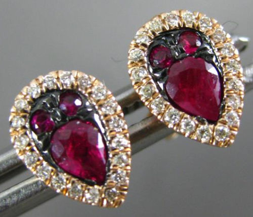 ESTATE 14KT ROSE GOLD EARRINGS. 3D HALO PEAR SHAPE DESIGN. DIAMONDS ARE F/G COLOR, VSSI CLARITY .12 CARATS. AAA RUBIES ARE .45 CARATS. MEASURES 8mm X 6mm. WRITTEN APPRAISAL AVAILABLE. COMES IN A PRESENTABLE GIFT BOX.