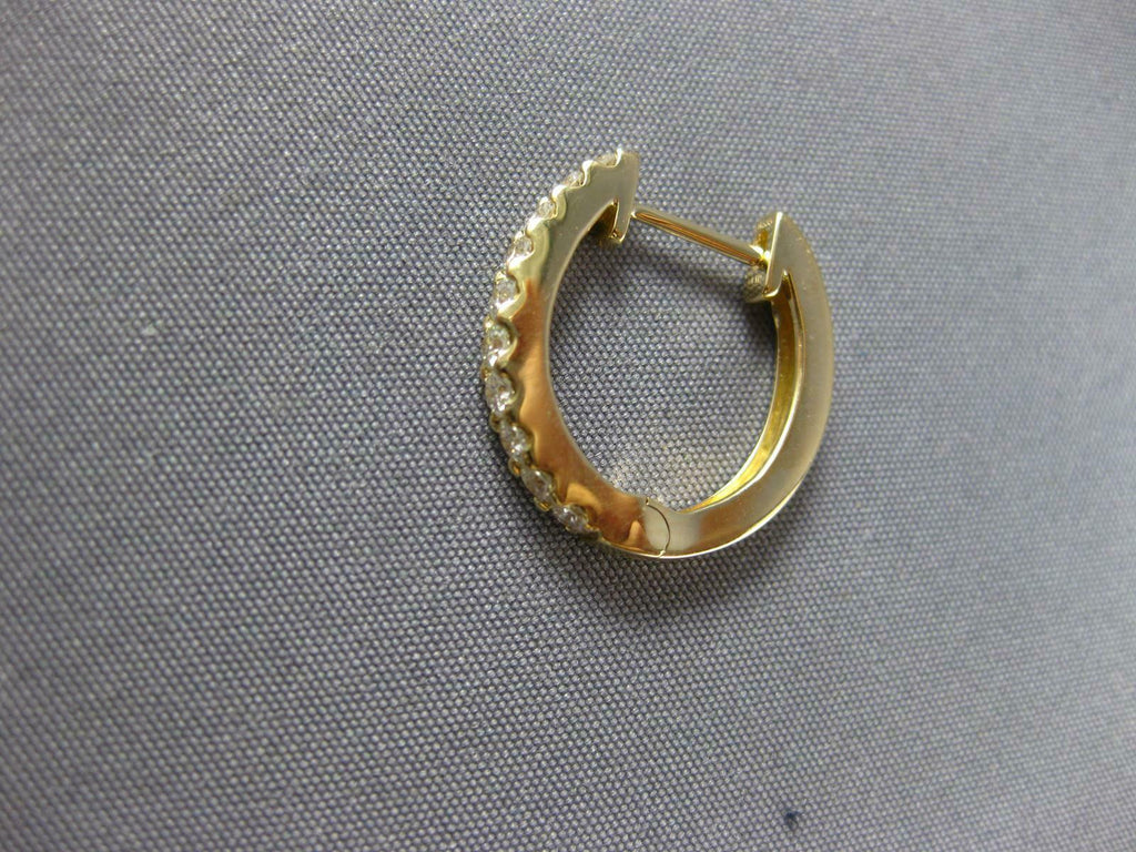 ESTATE 14KT YELLOW GOLD HUGGIE HOOP HANGING EARRINGS. 3D CLASSIC DESIGN. ROUND DIAMONDS ARE F/G COLOR, VSSI CLARITY .58 CARATS. MEASURES 16MM X 2MM X 16MM. WRITTEN APPRAISAL AVAILABLE. COMES IN A PRESENTABLE GIFT BOX.