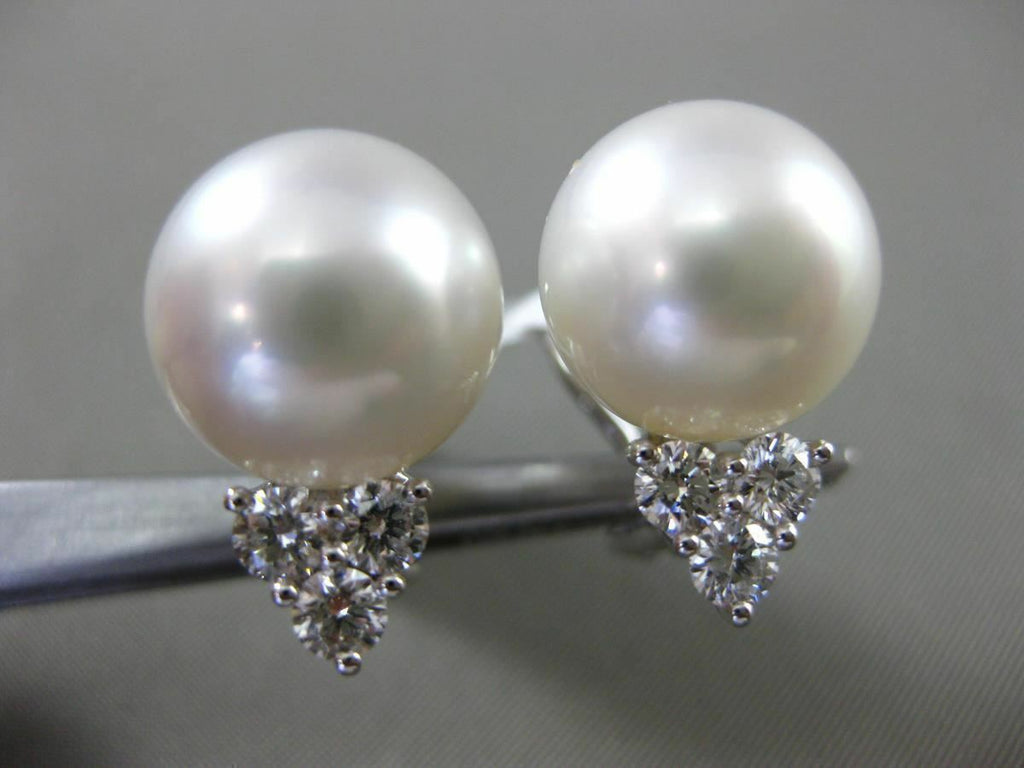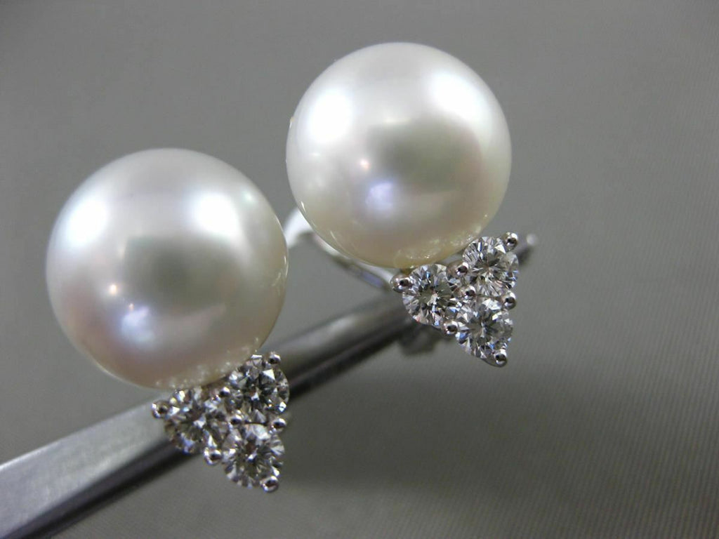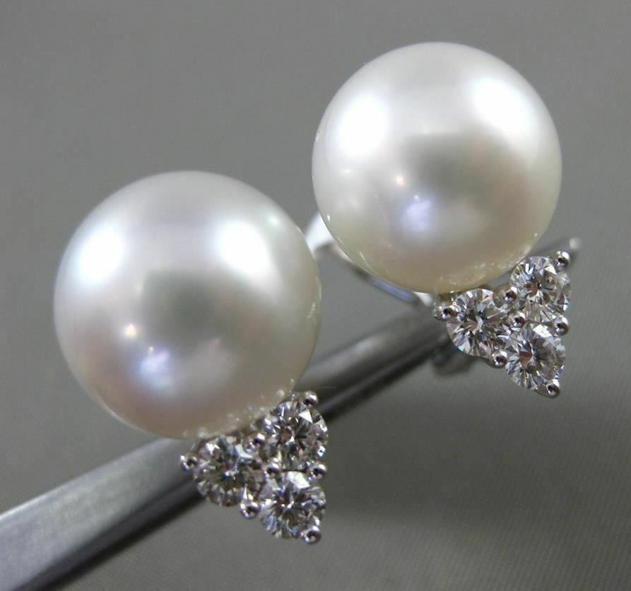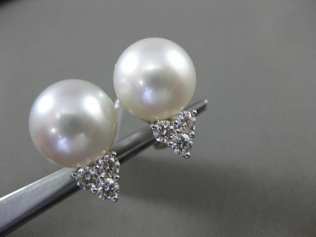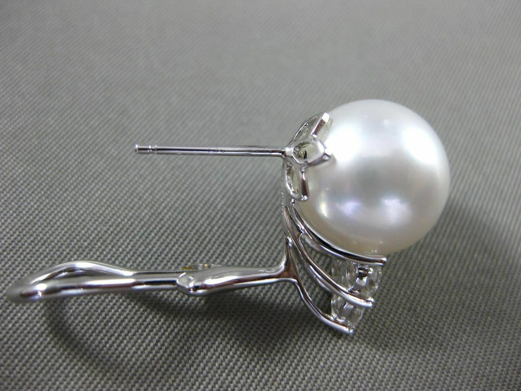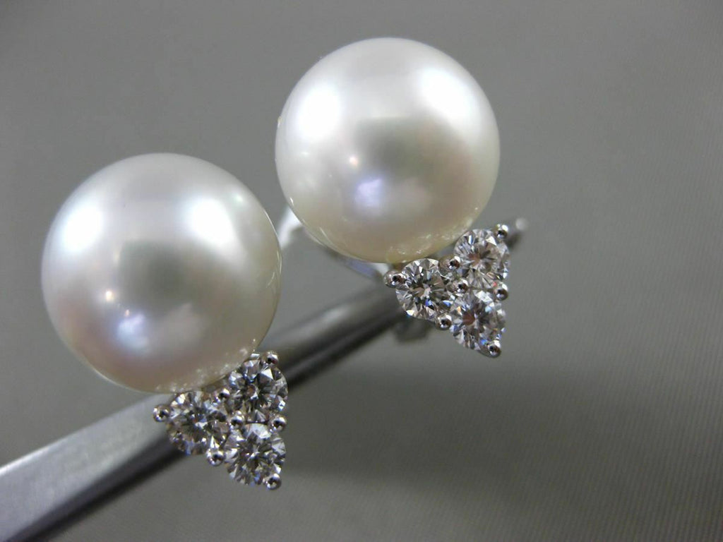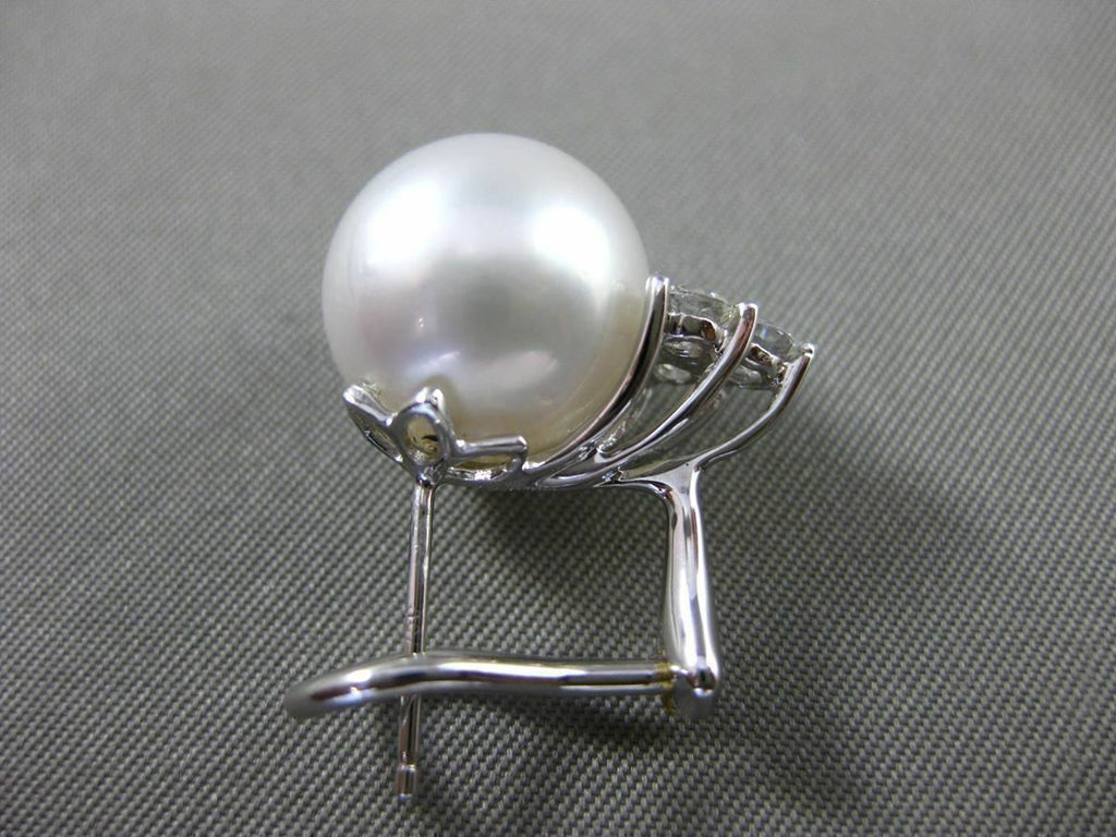 ESTATE LARGE 18KT WHITE GOLD CLIP ON EARRINGS. 3D, 3 STONE DESIGN. DIAMOND ARE F/G COLOR, VVS/VS CLARITY .60 CARATS. FEATURES AAA SOUTH SEA PEARL (12mm). MEASURES 17mm X 12mm WIDE. WRITTEN APPRAISAL AVAILABLE. COMES IN A PRESENTABLE GIFT BOX