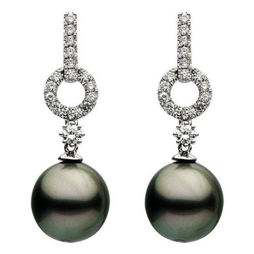 ESTATE 18KT WHITE GOLD LOVE HANGING EARRINGS. 3D CLASSIC ROUND CIRCULAR DESIGN. DIAMONDS ARE F/G COLOR, VSSI CLARITY .61 CARATS. AAA TAHITIAN PEARLS ARE 11-12MM WIDE. WRITTEN APPRAISAL AVAILABLE. COMES IN A PRESENTABLE GIFT BOX.