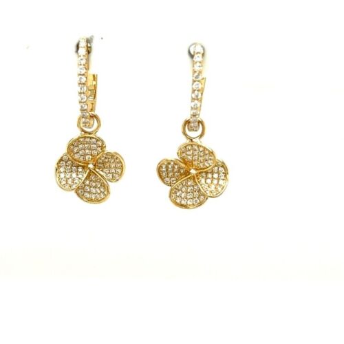ESTATE 18KT YELLOW GOLD HUGGIE HANGING EARRINGS. 3D CLASSIC FLOWER DESIGN. DIAMONDS ARE F/G COLOR, VSSI CLARITY .62 CARATS. WRITTEN APPRAISAL AVAILABLE. COMES IN A PRESENTABLE GIFT BOX.