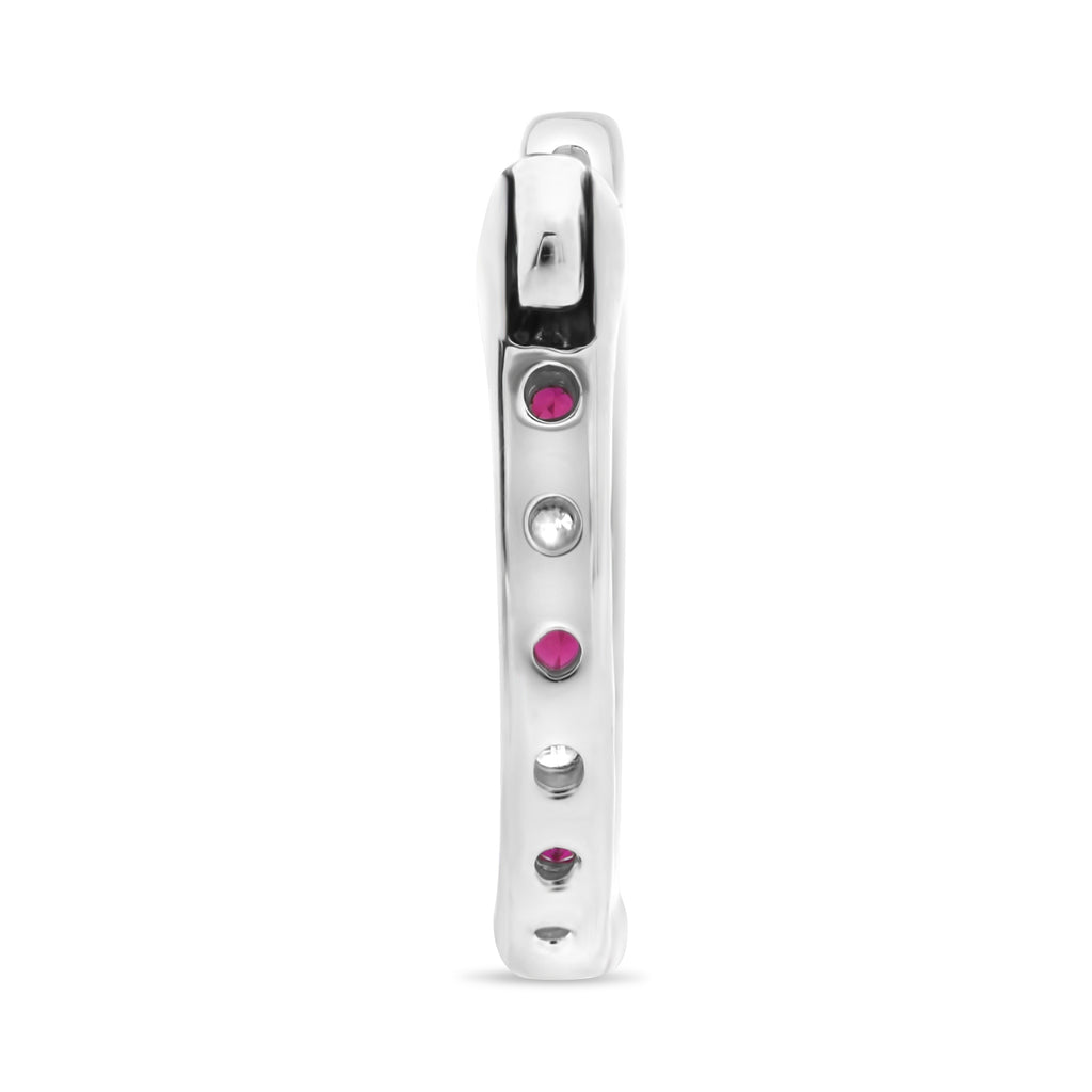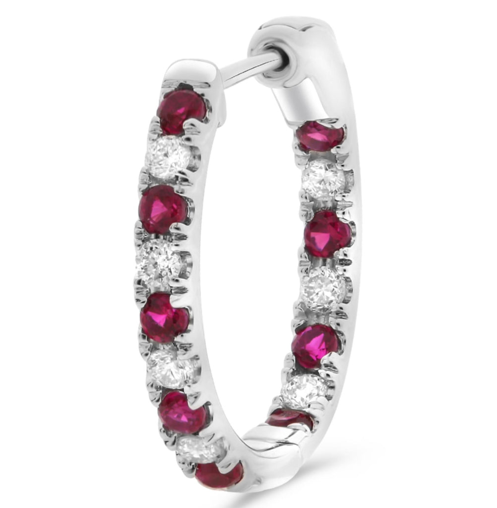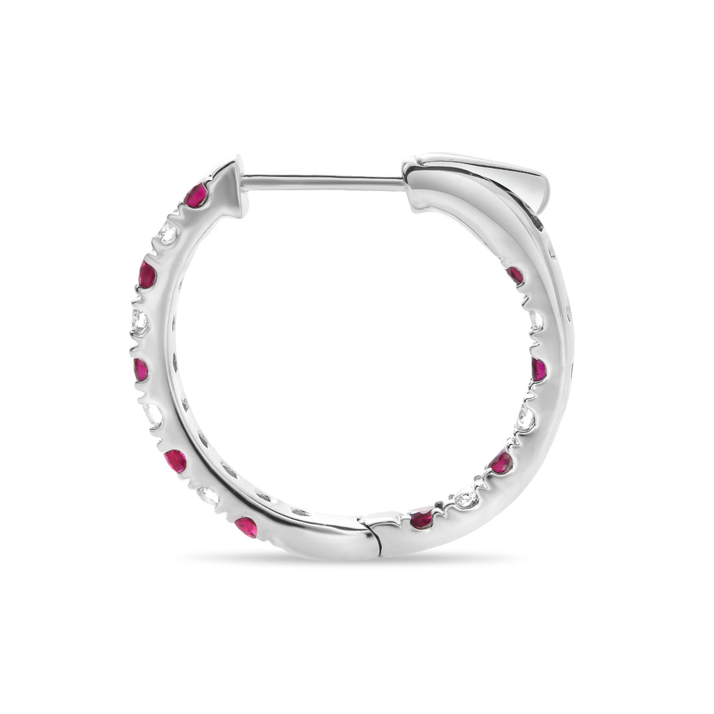 ESTATE 14KT WHITE GOLD HOOP HANGING EARRINGS. 3D INSIDE OUT CLASSIC DESIGN. ROUND DIAMONDS ARE F/G COLOR, VSSI CLARITY .25 CARATS. AAA RUBIES ARE .39 CARATS. MEASURES 0.5MM. WRITTEN APPRAISAL AVAILABLE. COMES IN A PRESENTABLE GIFT BOX.