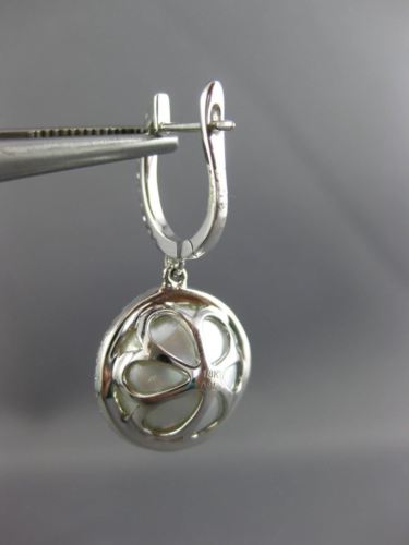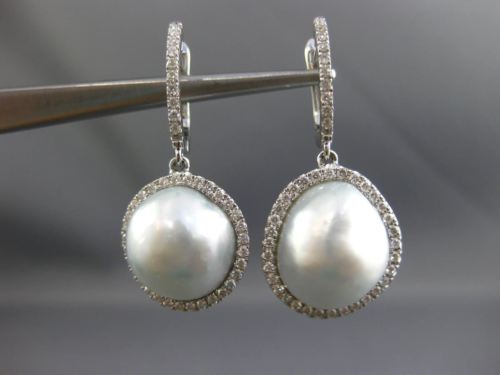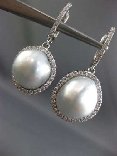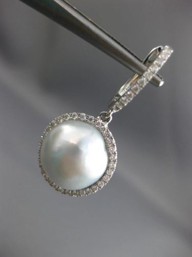 ESTATE 18KT WHITE GOLD HANGING EARRINGS. 3D HALO DESIGN. DIAMONDS ARE F/G COLOR VSSI CLARITY .64 CARATS. FEATURES AAA SOUTH SEA PEARLS 14mm WIDE. EARRINGS MEASURES 34mm X 15mm. WRITTEN APPRAISAL AVAILABLE. COMES IN A PRESENTABLE GIFT BOX.