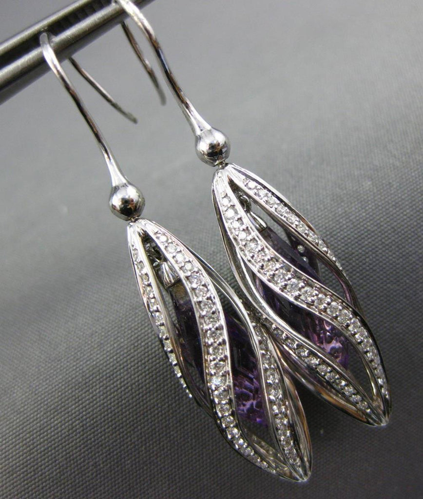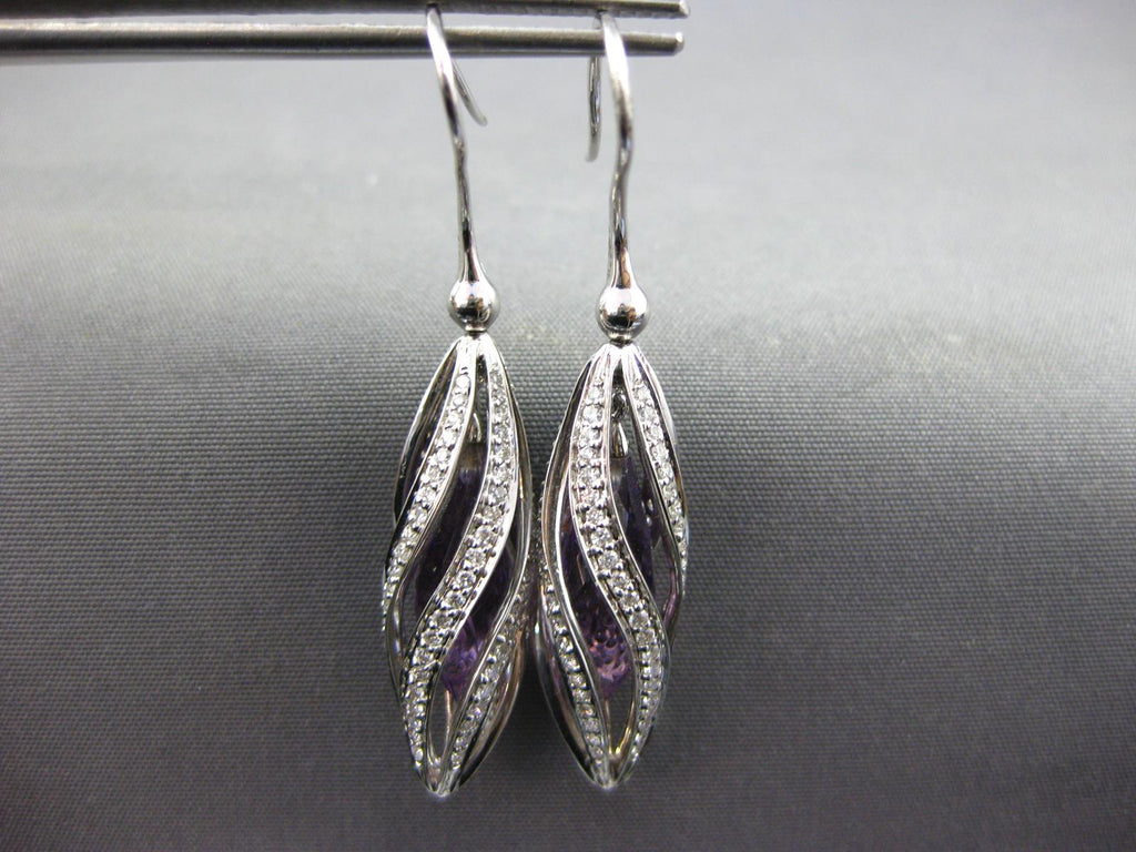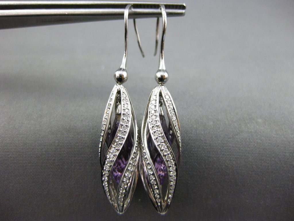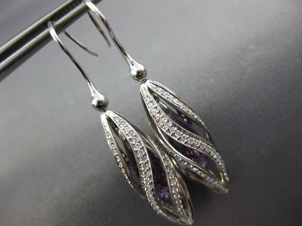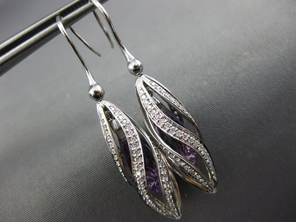 ESTATE 18KT WHITE GOLD LEVERBACK HANGING EARRINGS. 3D TEAR DROP MULTI WAVE DESIGN. DIAMONDS ARE F/G COLOR, VSSI CLARITY .98 CARATS. AAA AMETHYSTS ARE 5.74 CARATS. MEASURES 43.5mm X 9mm. WRITTEN APPRAISAL AVAILABLE. COMES IN A PRESENTABLE GIFT BOX.
