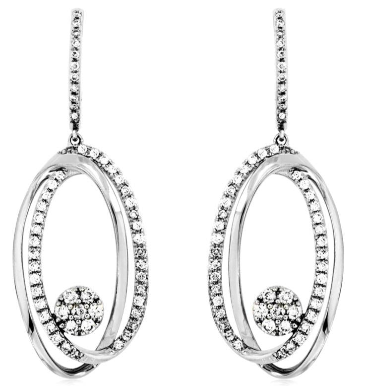 ESTATE 14KT WHITE GOLD HANGING EARRINGS. 3D FLOWER LOVE KNOT OVAL DESIGN. DIAMONDS ARE F/G COLOR, VSSI CLARITY .68 CARATS. WRITTEN APPRAISAL AVAILABLE. COMES IN A PRESENTABLE GIFT BOX.