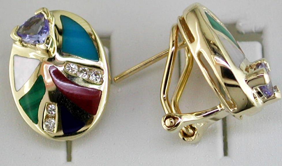 ESTATE 14KT YELLOW GOLD HANGING EARRINGS. 3D MULTI SHAPE OVAL CLIP ON DESIGN. DIAMONDS ARE F/G COLOR, VSSI CLARITY .15 CARATS. AAA MULTI SHAPE MULTI GEMS ARE .54 CARATS. WRITTEN APPRAISAL AVAILABLE. COMES IN A PRESENTABLE GIFT BOX.