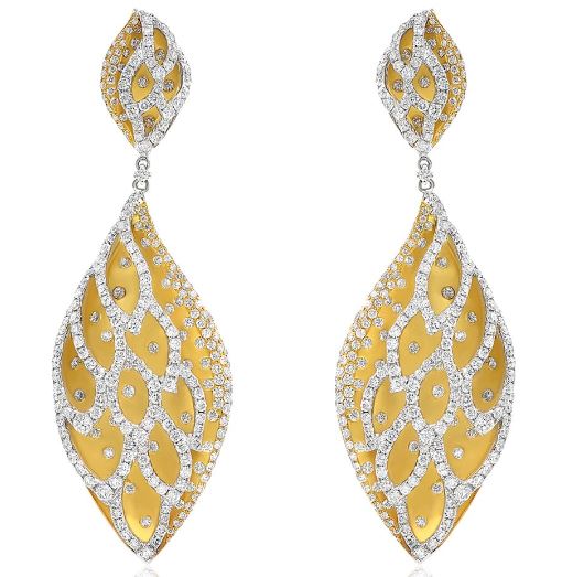 ESTATE 18KT WHITE AND YELLOW GOLD HANGING EARRINGS. 3D MULTI LEAF TEAR DROP DESIGN. DIAMONDS ARE F/G COLOR, VSSI CLARITY 7.10 CARATS. WRITTEN APPRAISAL AVAILABLE. COMES IN A PRESENTABLE GIFT BOX.