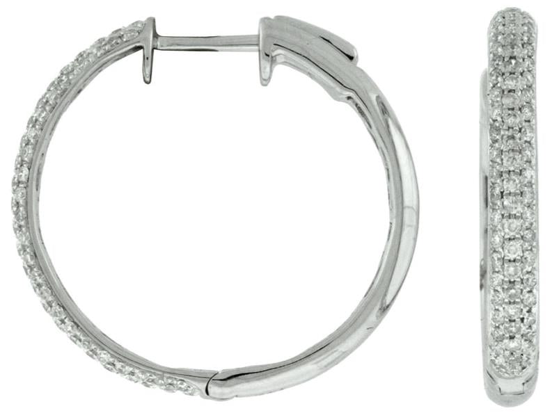 ESTATE 14KT WHITE GOLD HOOP HANGINGEARRINGS. 3D CLASSIC THREE ROW PAVEDESIGN. DIAMONDS ARE F/G COLOR, VSSI CLARITY .70 CARATS. WRITTEN APPRAISAL AVAILABLE. COMES IN A PRESENTABLE GIFT BOX.