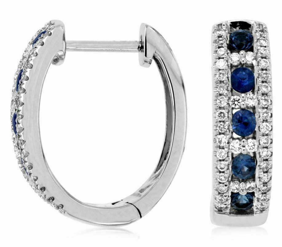 ESTATE 14KT WHITE GOLD HUGGIE HOOP EARRINGS. 3D CLASSIC DESIGN. ROUND DIAMONDS ARE F/G COLOR, VSSI CLARITY .27 CARATS. AAA ROUND SAPPHIRES ARE .46 CARATS. WRITTEN APPRAISAL AVAILABLE. COMES IN A PRESENTABLE GIFT BOX.