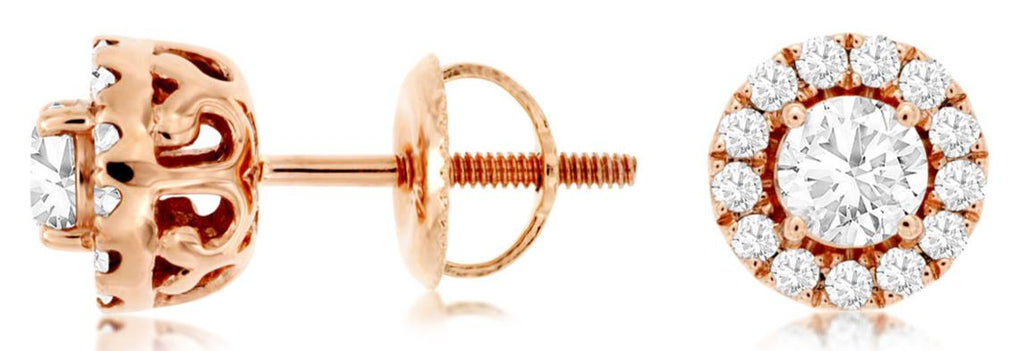 ESTATE 14KT ROSE GOLD SCREWBACK EARRINGS. 3D FLOWER HALO FILIGREE DESIGN. ROUND DIAMONDS ARE F/G COLOR, VSSI CLARITY .75 CARATS. WRITTEN APPRAISAL AVAILABLE. COMES IN A PRESENTABLE GIFT BOX.