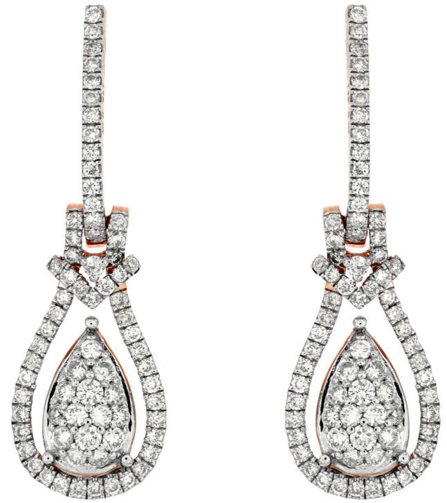 ESTATE 14KT WHITE AND ROSE GOLD HANGING EARRINGS. 3D CLUSTER LOVE KNOT TEAR DROP DESIGN. DIAMONDS ARE F/G COLOR, VSSI CLARITY .75 CARATS. WRITTEN APPRAISAL AVAILABLE. COMES IN A PRESENTABLE GIFT BOX.