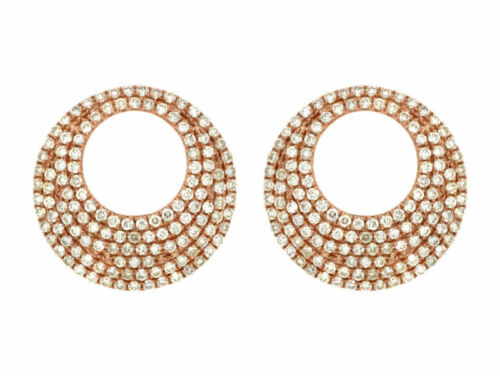 ESTATE 14KT ROSE GOLD FUN EARRINGS. 3D MULTI ROW CIRCULAR DESIGN. WHITE DIAMONDS ARE F/G COLOR, VSSI CLARITY .75 CARATS. WRITTEN APPRAISAL AVAILABLE. COMES IN A PRESENTABLE GIFT BOX.