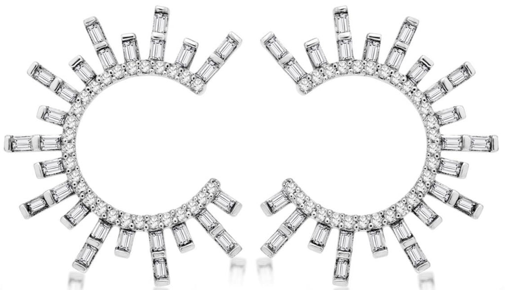 ESTATE 14KT WHITE GOLD LOVE EARRINGS. 3D SEMI MOON DESIGN. ROUND AND BAGUETTE DIAMONDS ARE F/G COLOR, VSSI CLARITY .75 CARATS. WRITTEN APPRAISAL AVAILABLE. COMES IN A PRESENTABLE GIFT BOX.