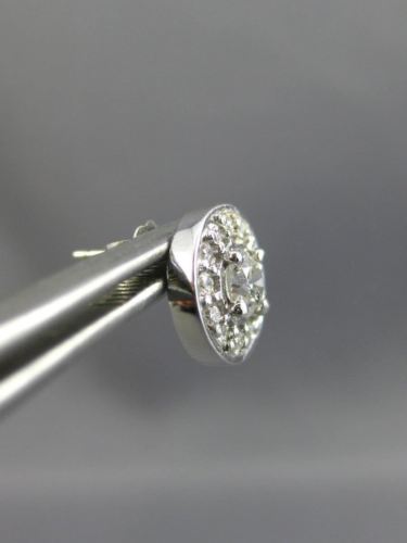 ESTATE 14KT WHITE GOLD STUD EARRINGS. 3D SOLITAIRE ROUND HALO DESIGN. DIAMONDS ARE F/G COLOR, VSSI CLARITY .75 CARATS. MEASURES 10mm WIDE. WRITTEN APPRAISAL AVAILABLE. COMES IN A PRESENTABLE GIFT BOX.