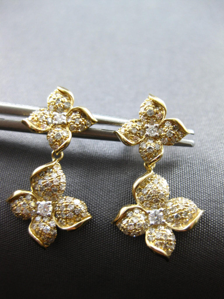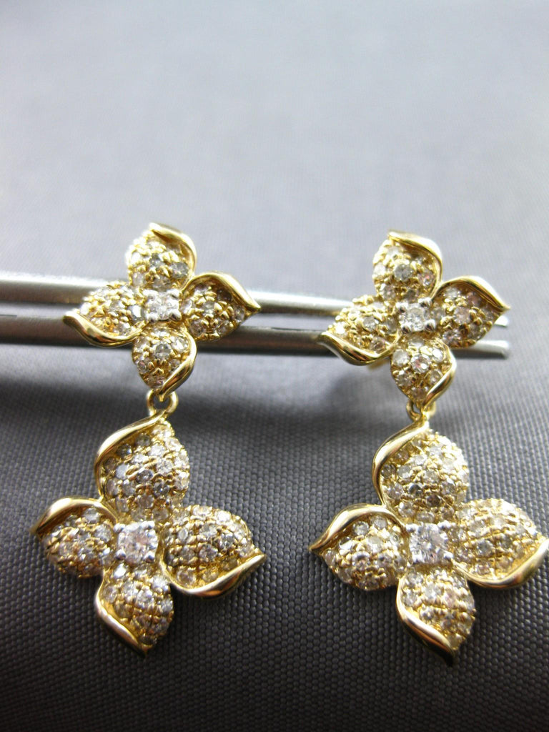 ESTATE 14KT YELLOW GOLD HANGING EARRINGS. 3D FLOWER STAR FOUR LEAF CLOVER DESIGN. DIAMONDS ARE F/G COLOR, VSSI CLARITY .75 CARATS. MEASURES  23mm X 12mm. WRITTEN APPRAISAL AVAILABLE. COMES IN A PRESENTABLE GIFT BOX.