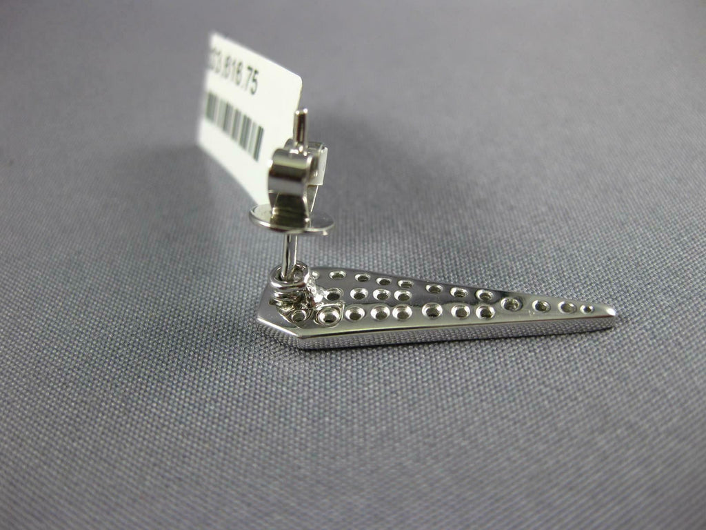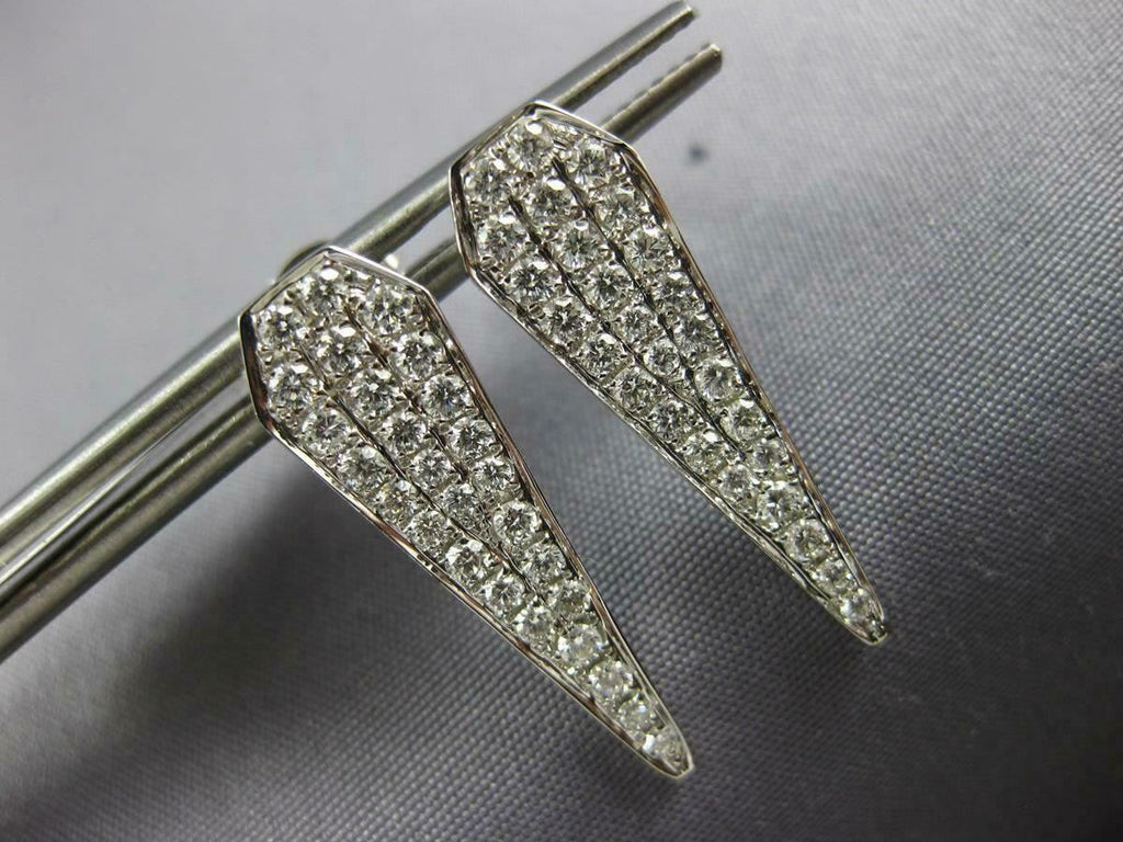 ESTATE 18KT WHITEGOLD HANGINGEARRINGS. 3D PAVE TRIANGULAR ELONGATED PENTAGONDESIGN. DIAMONDS ARE F/G COLOR, VSSI CLARITY .75CARATS.MEASURES 23mm X 7mm. WRITTEN APPRAISAL AVAILABLE. COMES IN A PRESENTABLE GIFT BOX.