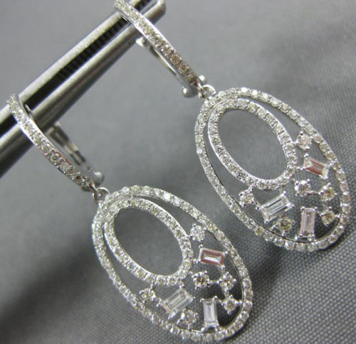 ESTATE 14KT WHITE GOLD HANGING EARRINGS. 3D CLASSIC OVAL DESIGN. ROUND AND BAGUETTE DIAMONDS ARE F/G COLOR, VSSI CLARITY .75 CARATS. MEASURES 31mm X 10mm. WRITTEN APPRAISAL AVAILABLE. COMES IN A PRESENTABLE GIFT BOX.