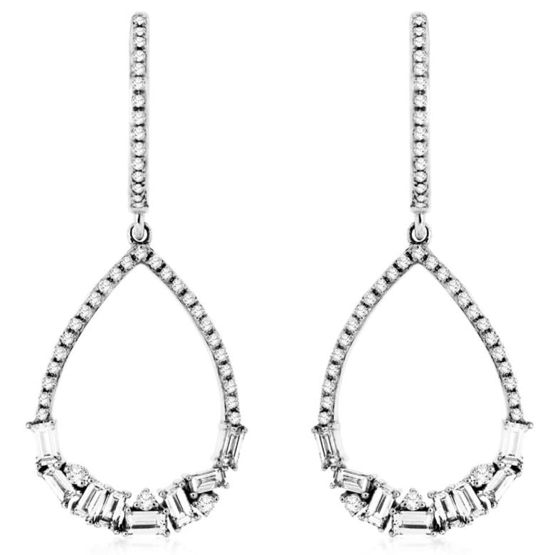 ESTATE 14KT WHITE GOLD HANGING EARRINGS. 3D CLASSIC OPEN TEAR DROP DESIGN. ROUND DIAMONDS ARE F/G COLOR, VSSI CLARITY .27 CARATS. BAGUETTE DIAMONDS ARE .49 CARATS. WRITTEN APPRAISAL AVAILABLE. COMES IN A PRESENTABLE GIFT BOX.