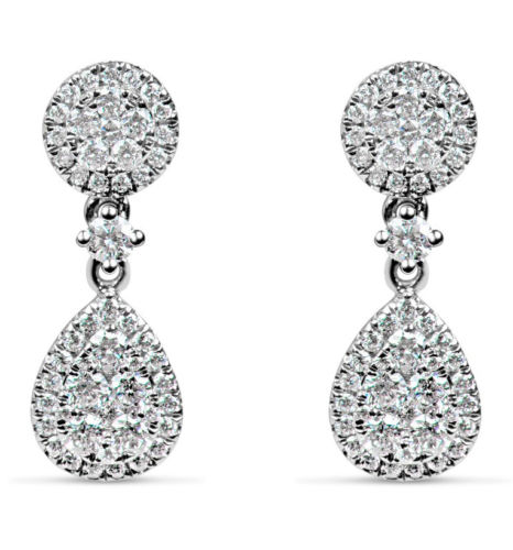 ESTATE 18KT WHITE GOLD HANGING EARRINGS. 3D TEAR DROP CLUSTER DESIGN. DIAMONDS ARE F/G COLOR, VSSI CLARITY .78 CARATS. WRITTEN APPRAISAL AVAILABLE. COMES IN A PRESENTABLE GIFT BOX.