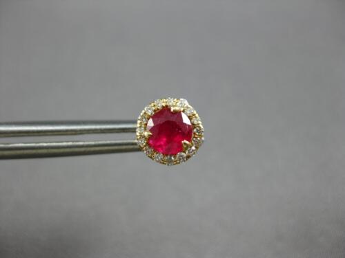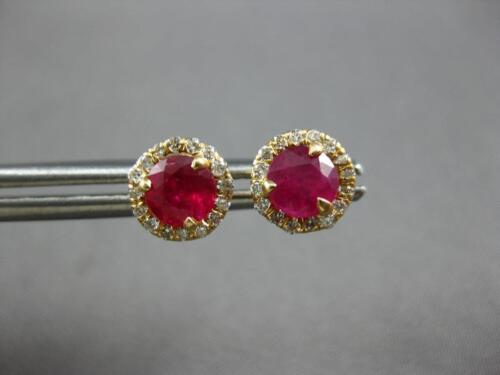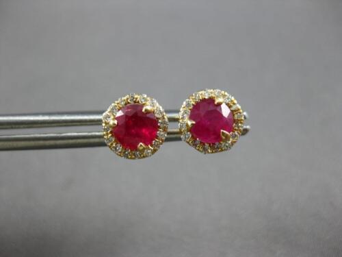 ESTATE 14KT YELLOW GOLD STUD EARRINGS. 3D CLASSIC MARTINI HALO DESIGN. ROUND DIAMONDS ARE F/G COLOR, VSSI CLARITY .16 CARATS. AAA ROUND RUBIES ARE .63 CARATS. MEASURES 6.5MM WIDE. WRITTEN APPRAISAL AVAILABLE. COMES IN A PRESENTABLE GIFT BOX.