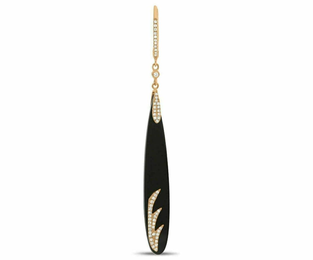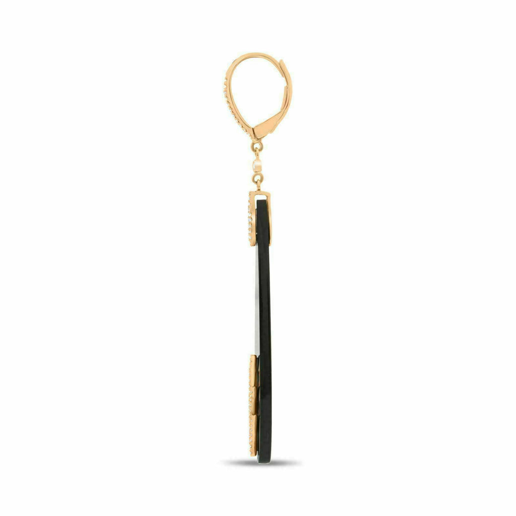 ESTATE 14KT ROSE GOLD LEVERBACK HANGING FUN EARRINGS. 3D CLASSIC DESIGN. DIAMONDS ARE F/G COLOR, VSSI CLARITY .28 CARATS. AAA BLACK ONYX IS 7.72 CARATS. MEASURES 61MM X 6MM. WRITTEN APPRAISAL AVAILABLE. COMES IN A PRESENTABLE GIFT BOX.