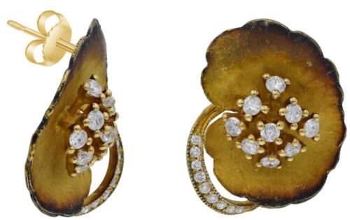 ESTATE 18KT YELLOW GOLD STUD HANGING EARRINGS. 3D CLUSTER FLORAL DESIGN. ROUND DIAMONDS ARE F/G COLOR, VSSI CLARITY .80 CARATS.