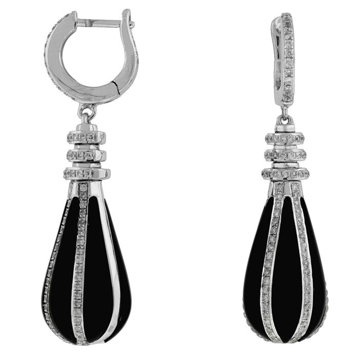 ESTATE 14KT WHITE GOLD FUN HANGING EARRINGS. 3D CLASSIC DESIGN. DIAMONDS ARE F/G COLOR, VSSI CLARITY .80 CARATS. FEATURES AAA ONYX. WRITTEN APPRAISAL AVAILABLE. COMES IN A PRESENTABLE GIFT BOX.