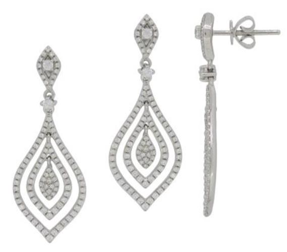 ESTATE 14KT WHITE GOLD FUN HANGING EARRINGS. 3D CLASSIC TRIPLE TEAR DROP DESIGN. DIAMONDS ARE F/G COLOR, VSSI CLARITY .81 CARATS. MEASURES 13mm WIDE. WRITTEN APPRAISAL AVAILABLE. COMES IN A PRESENTABLE GIFT BOX.