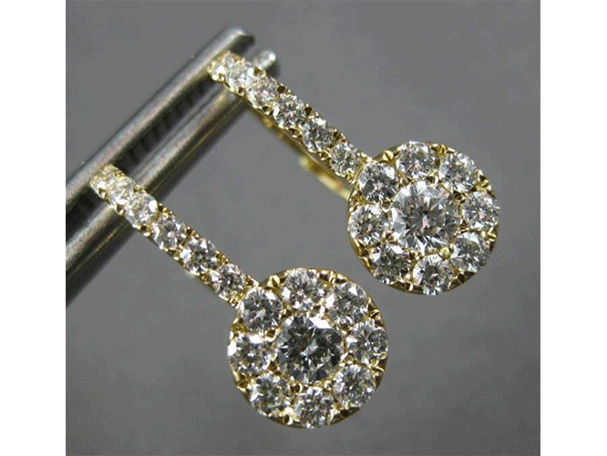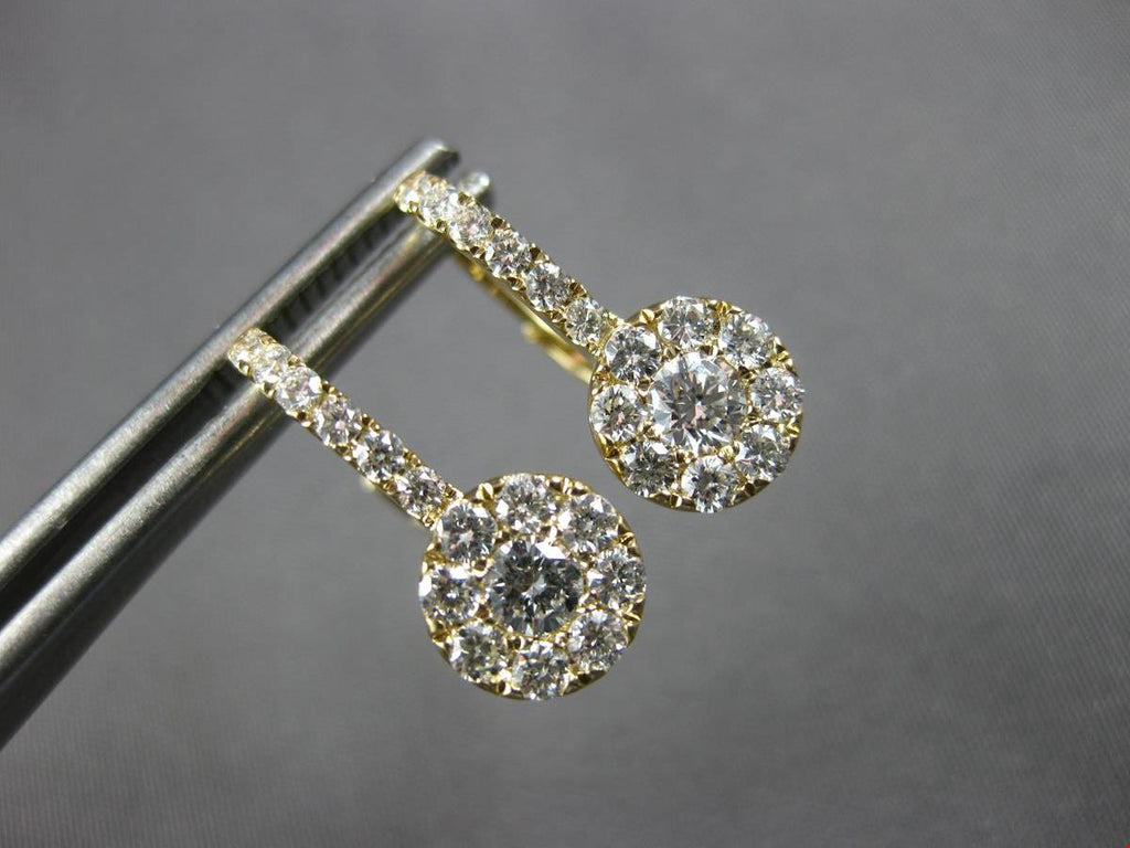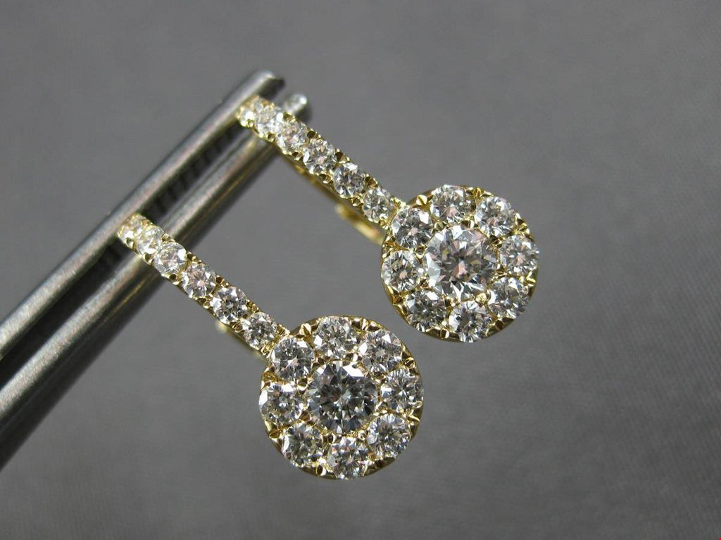 ESTATE 14KT YELLOW GOLD LEVERBACK HANGING EARRINGS. 3D CLASSIC HALO SOLITAIRE DESIGN. ROUND DIAMONDS ARE F/G COLOR, VVS-VS CLARITY .82 CARATS. MEASURES 15.5mm X 7mm. WRITTEN APPRAISAL AVAILABLE. COMES IN A PRESENTABLE GIFT BOX.