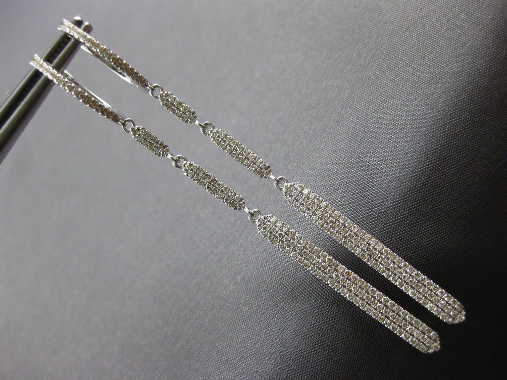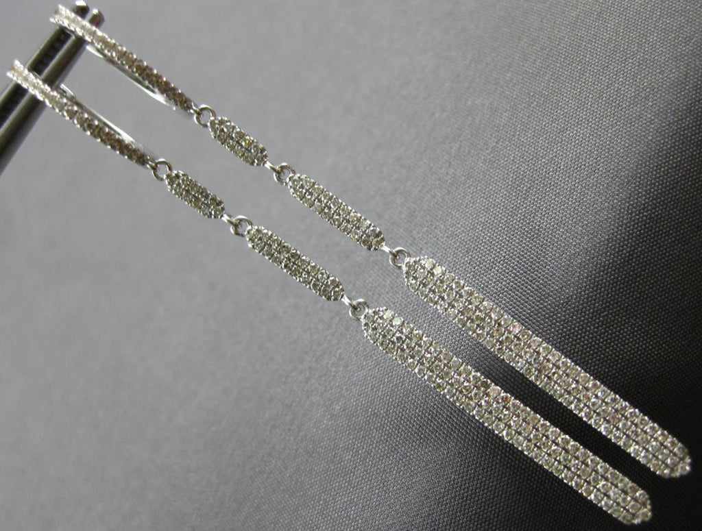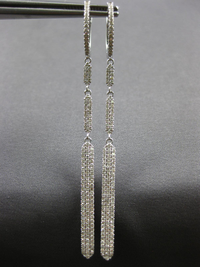 ESTATE 14KT WHITE GOLD HUGGIE HANGING EARRINGS. 3D PAVE BAR JOURNEY DESIGN. DIAMONDS ARE F/G COLOR, VSSI CLARITY .83 CARATS. MEASURES 65mm X 3mm. WRITTEN APPRAISAL AVAILABLE. COMES IN A PRESENTABLE GIFT BOX.