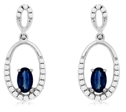 ESTATE 14KT WHITE GOLD HANGING EARRINGS. 3D OVAL ETOILE CLASSIC DESIGN. DIAMONDS ARE F/G COLOR, VSSI CLARITY .20 CARATS. AAA SAPPHIRES ARE .60 CARATS. WRITTEN APPRAISAL AVAILABLE. COMES IN A PRESENTABLE GIFT BOX.