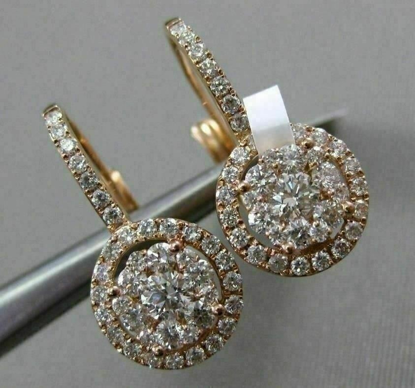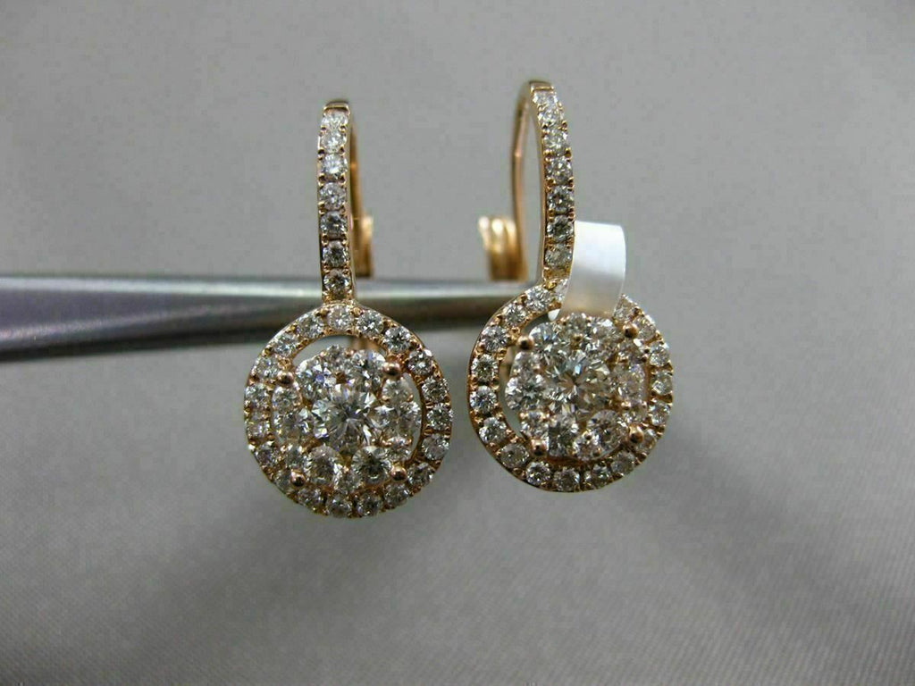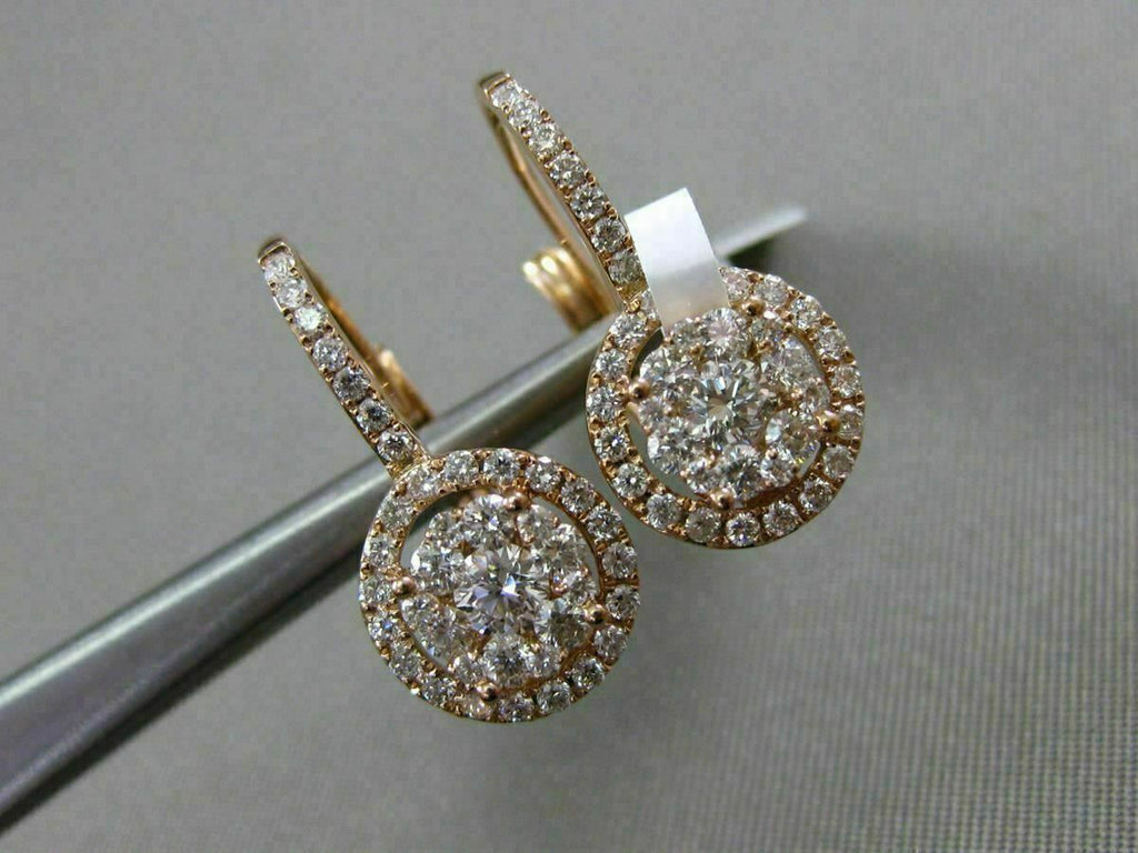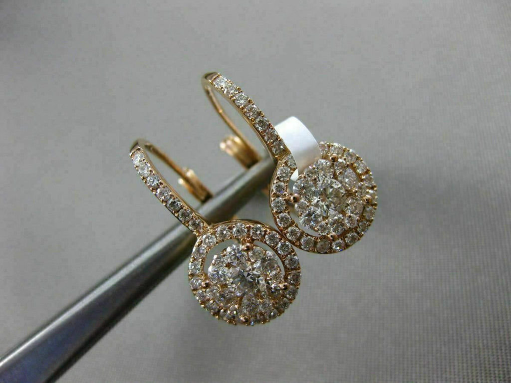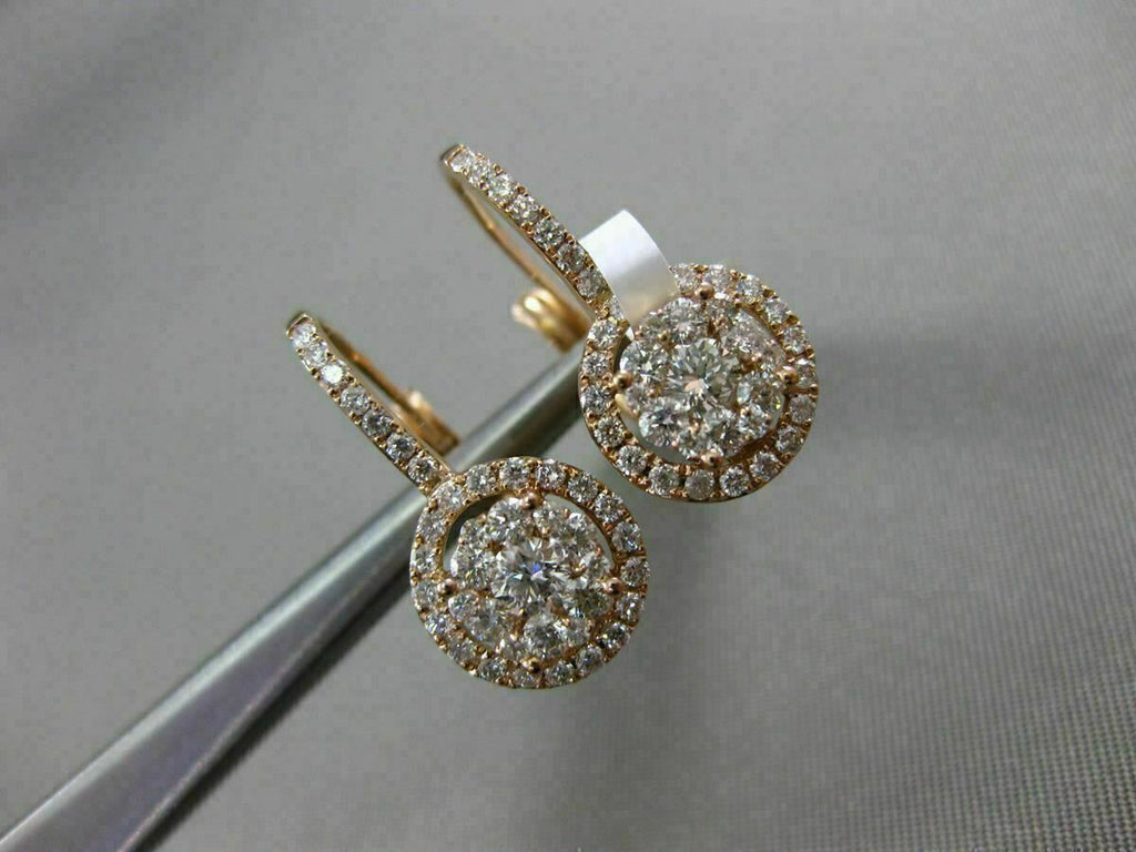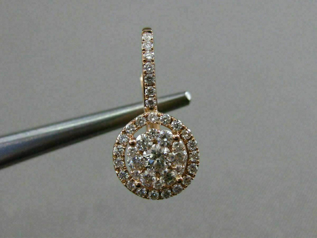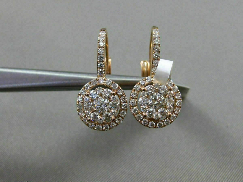ESTATE 18KT ROSE GOLD HANGING EARRINGS. 3D HALO CLUSTER CLASSIC LEVER BACK DESIGN. DIAMONDS ARE F/G COLOR, VS CLARITY .86 CARATS. MEASURES 19mm X 9mm WIDE. WRITTEN APPRAISAL AVAILABLE. COMES IN A PRESENTABLE GIFT BOX