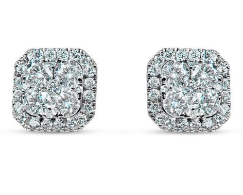 ESTATE 18KT WHITE GOLD STUD EARRINGS. 3D CLASSIC SQUARE CLUSTER OCTAGON DESIGN. DIAMONDS ARE F/G COLOR, VSSI CLARITY .86 CARATS. WRITTEN APPRAISAL AVAILABLE. COMES IN A PRESENTABLE GIFT BOX.
