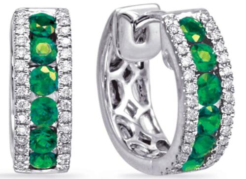 ESATATE 14KT WHITE GOLD HUGGIE EARRINGS. 3D CLASSIC THREE ROW DESIGN. ROUND DIAMONDS ARE F/G COLOR, VSSI CLARITY .20 CARATS. AAA EMERALDS ARE .68 CARATS. WRITTEN APPRAISAL AVAILABLE. COMES IN A PRESENTABLE GIFT BOX.