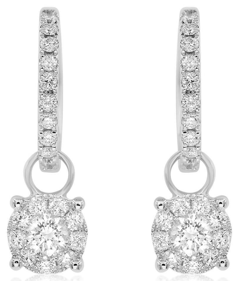 ESTATE 14KT WHITE GOLD FUN HANGING EARRINGS. 3D CLUSTER FLOWER DESIGN. DIAMONDS ARE F/G COLOR, VSSI CLARITY. CENTER DIAMONDS ARE .34 CARATS. SIDE DIAMONDS ARE .55 CARATS. WRITTEN APPRAISAL AVAILABLE. COMES IN A PRESENTABLE GIFT BOX.