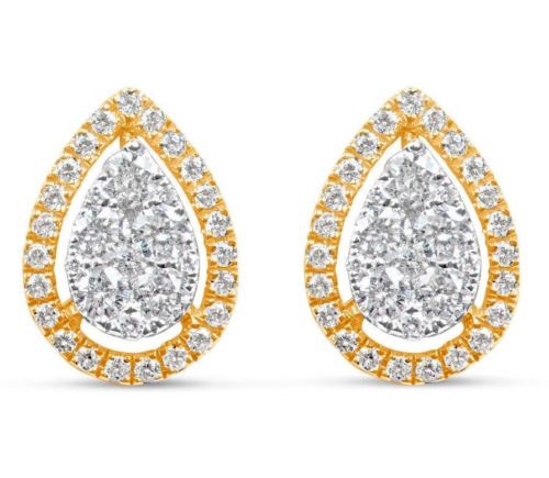 ESTATE 18KT WHITE AND YELLOW GOLD STUD EARRINGS. 3D CLASSIC CLUSTER TEAR DROP PEAR SHAPE HALO DESIGN. DIAMONDS ARE F/G COLOR, VSSI CLARITY .89 CARATS. WRITTEN APPRAISAL AVAILABLE. COMES IN A PRESENTABLE GIFT BOX.