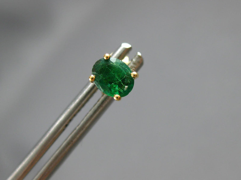 ESTATE 14KT YELLOW GOLD STUD EARRINGS. 3D CLASSIC SOLITAIRE DESIGN. AAA OVAL EMERALDS ARE .90 CARATS. MEASURES 4.8mm X 3.8mm. WRITTEN APPRAISAL AVAILABLE. COMES IN A PRESENTABLE GIFT BOX.