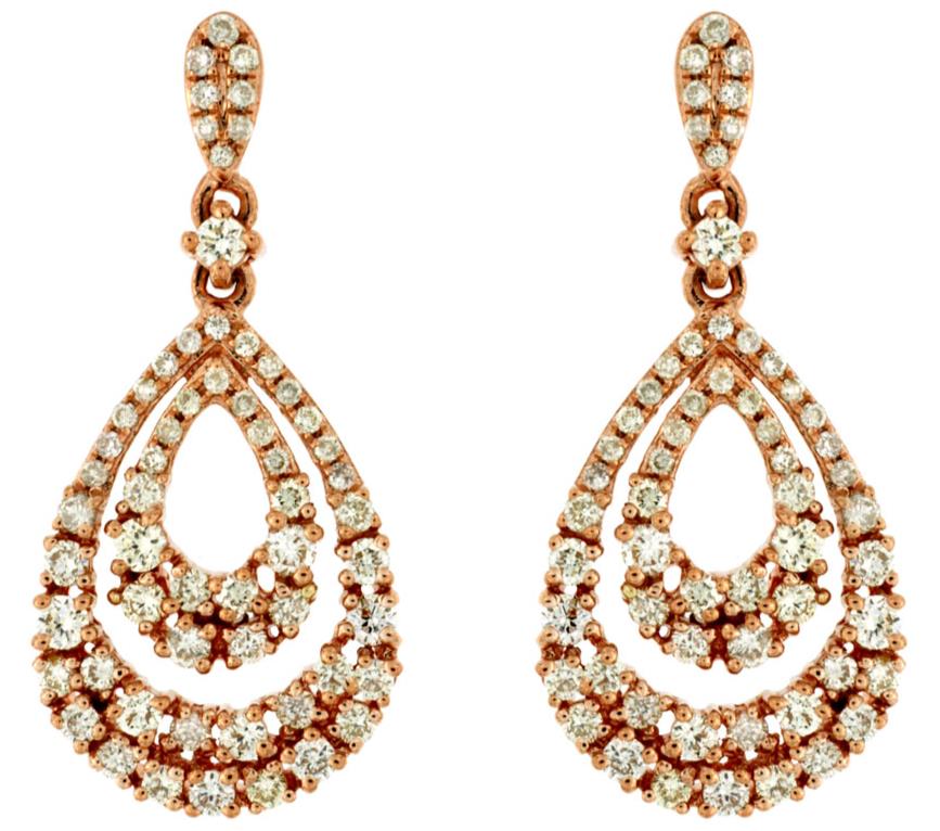 ESTATE 14KT ROSE GOLD HANGINGEARRINGS. 3D CLASSIC DOUBLE ROW TEAR DROPDESIGN. DIAMONDS ARE F/G COLOR, VSSI CLARITY 0.90CARATS. WRITTEN APPRAISAL AVAILABLE. COMES IN A PRESENTABLE GIFT BOX.