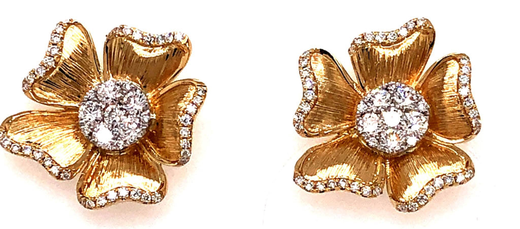 ESTATE 18KT YELLOW GOLD STUD EARRINGS. 3D FLOWER ROSE DESIGN. DIAMONDS ARE F/G COLOR, VSSI CLARITY .90 CARATS. WRITTEN APPRAISAL AVAILABLE. COMES IN A PRESENTABLE GIFT BOX.