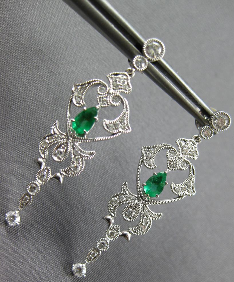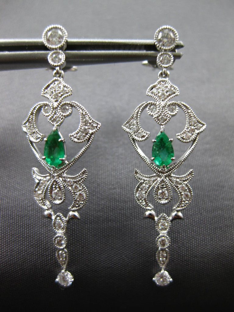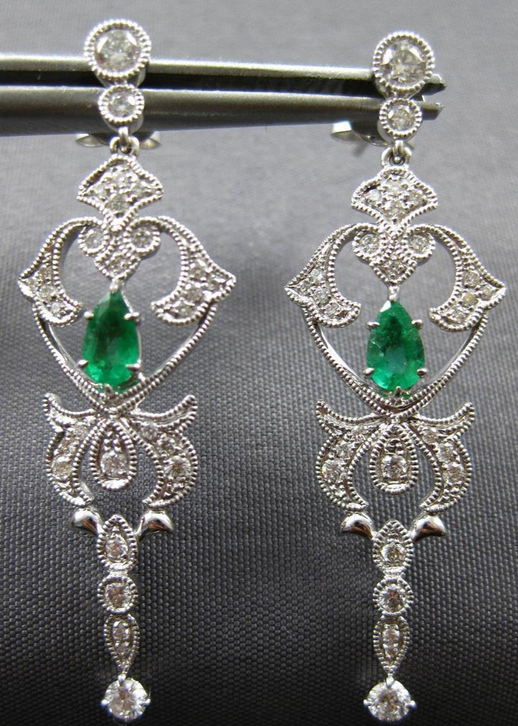ESTATE 18KT WHITE GOLD EARRINGS. 3D FILIGREE CHANDELIER DESIGN. ROUND DIAMONDS ARE F/G COLOR, VSSI CLARITY .54 CARATS. AAA PEAR SHAPE EMERALDS ARE .36 CARATS. MEASURES 38mm X 12mm. WRITTEN APPRAISAL AVAILABLE. COMES IN A PRESENTABLE GIFT BOX.