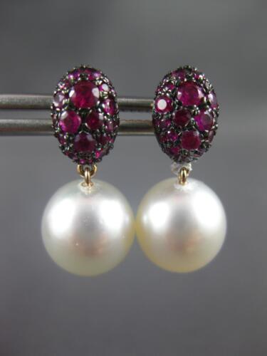ESTATE 18KT ROSE GOLD FUN HANGING EARRINGS. 3D CLUSTER TEAR DROP DESIGN. AAA RUBIES ARE .92 CARATS. FEATURES 10mm WIDE AAA SOUTH SEA PEARLS. EARRINGS MEASURE 10mm X 21.5mm. WRITTEN APPRAISAL AVAILABLE. COMES IN A PRESENTABLE GIFT BOX.