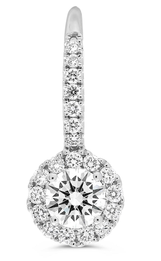 ESTATE 14KT WHITE GOLD LEVERBACK HANGING  EARRINGS. 3D CLASSIC ROUND HALO DESIGN. DIAMONDS ARE F/G COLOR, VSSI CLARITY .92 CARATS. MEASURES 18MM X 7MM.  WRITTEN APPRAISAL AVAILABLE. COMES IN A PRESENTABLE GIFT BOX.